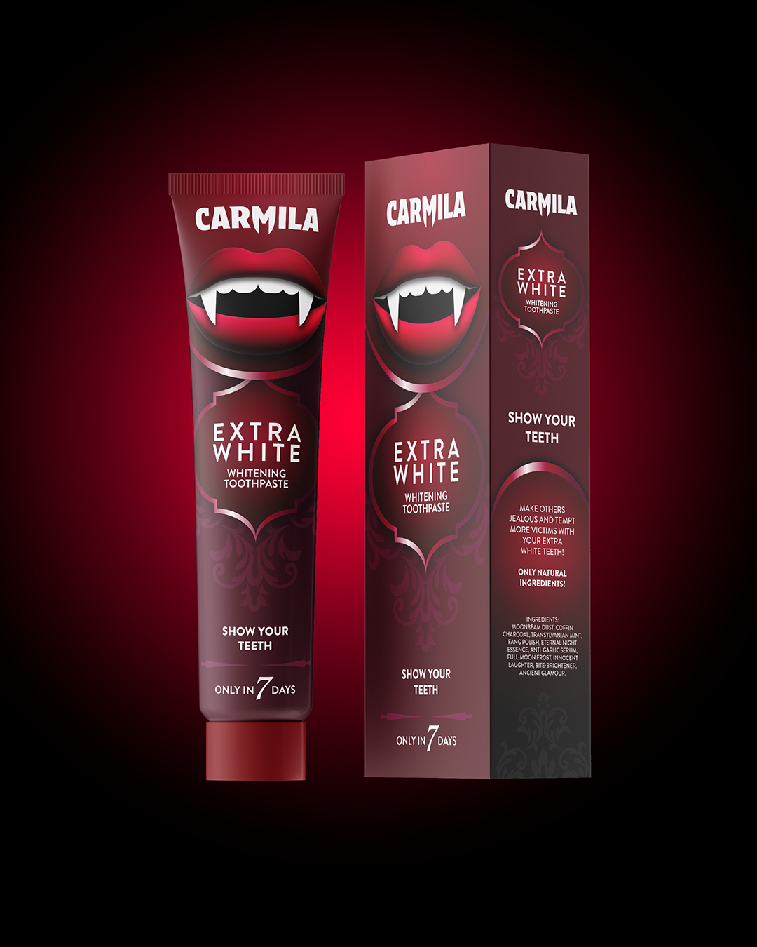 Halloween-themed packaging design. I wanted to do something fun, and a whitening toothpaste for vampires came to my mind. This project was a very quick exercise (I think I spent about 5 hours on it).